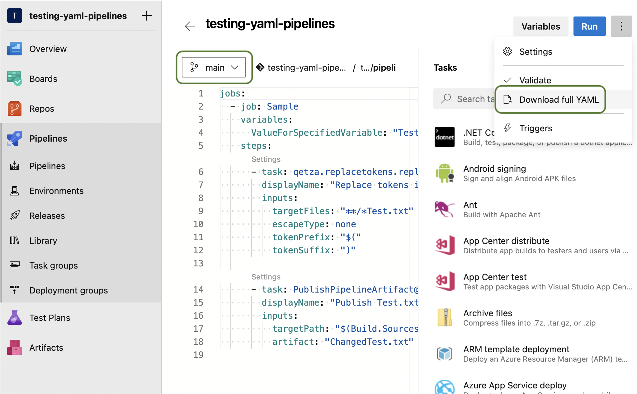 Finally, select the branch you want to use to preview your pipeline, and after the page reloads click on the three dots button at the top right and on "Download full YAML"
